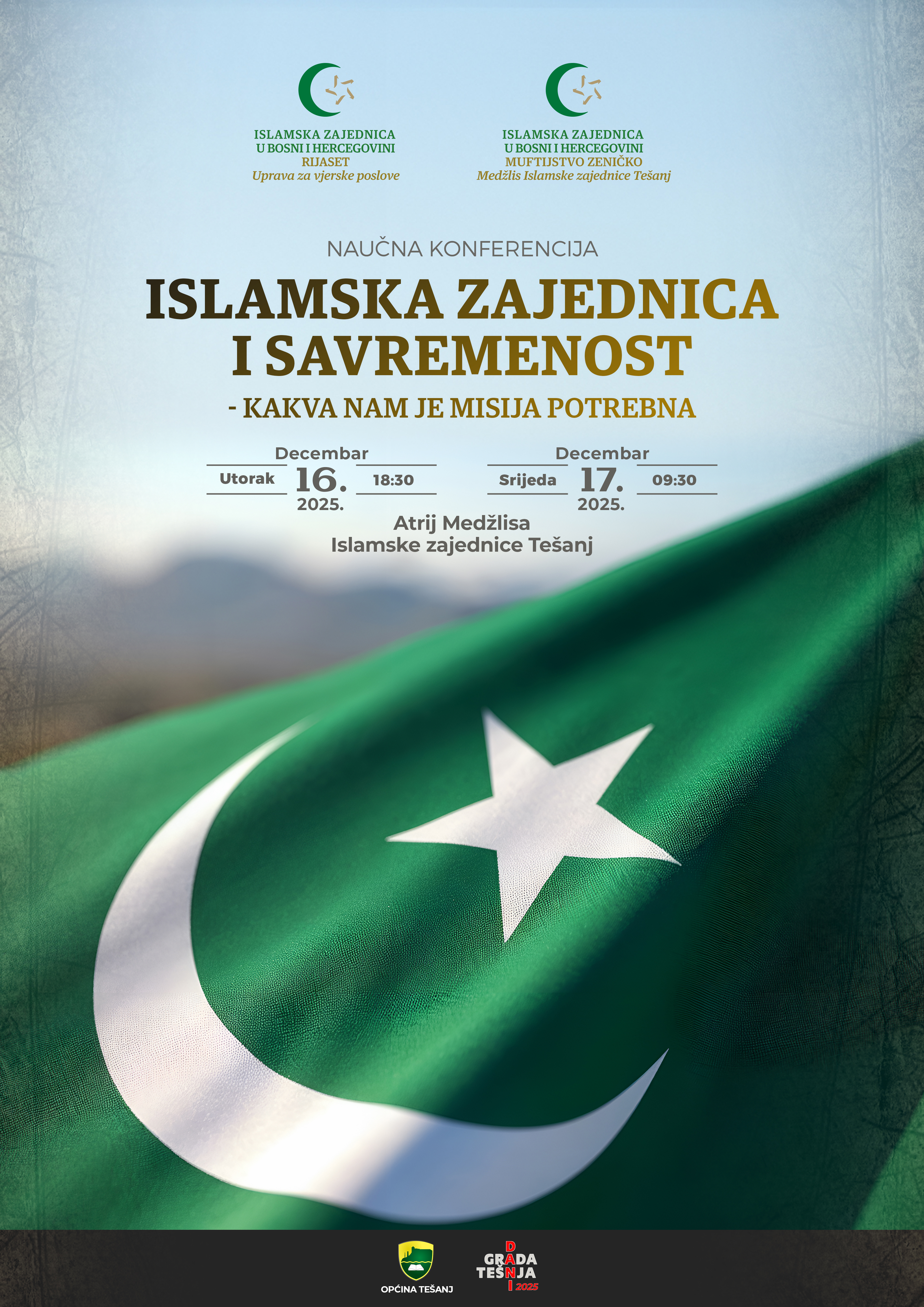 Uprava za vjerske poslove Rijaseta Islamske zajednice u Bosni i Hercegovini i Medžlis Islamske zajednice Tešanj organizuju naučnu konferenciju pod nazivom „Islamska zajednica i savremenost – Kakva nam je misija potrebna“, koja će biti održana 16. i 17. decembra 2025. godine u Tešnju.